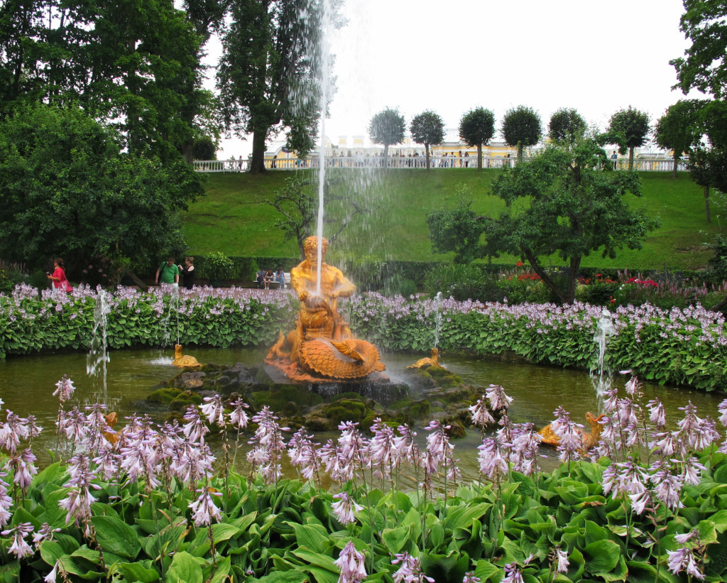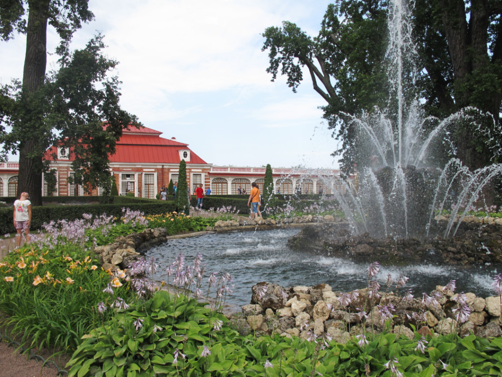 Кроме Большого каскада в Петергофском парке множество красивых фонтанов. Нашей целью в этот день был дворец «Монплезир», он находится на заливе, в окружении великолепного сада, в котором расположены фонтаны — шутихи.