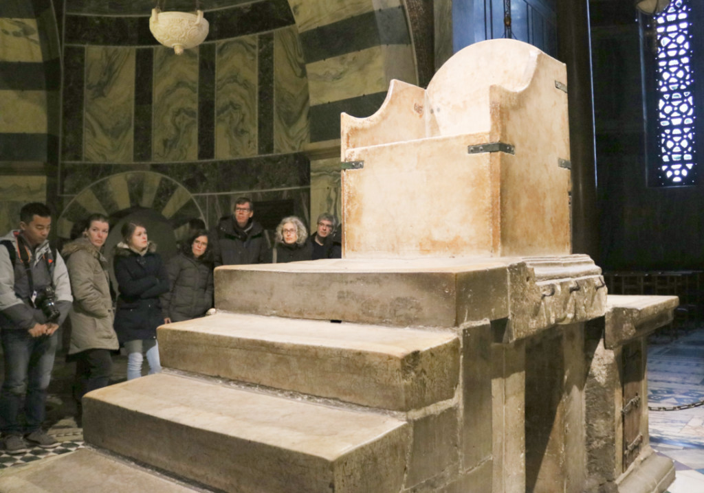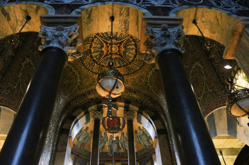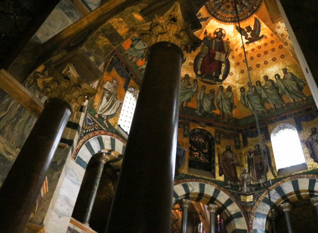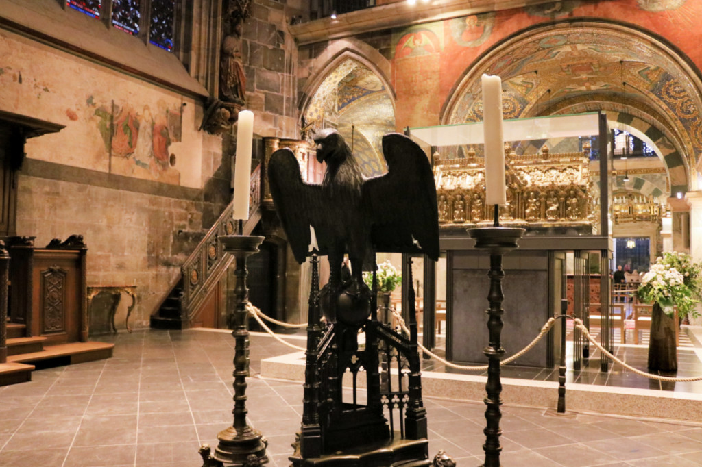 Чтобы посмотреть трон Карла Великого на втором этаже необходимо попасть на экскурсию, которая начинается в капелле каждый час. Однако только в 14-00 экскурсия идет на английском языке, все остальное время на немецком. Чтобы не ждать несколько часов, мы решили, что примерно знаем о чем пойдет речь и пошли на немецкую экскурсию. Главное — нас провели в те места, которые закрыты для обычных туристов. Например в алтарную часть, где можно увидеть старинную кафедру времен Карла.